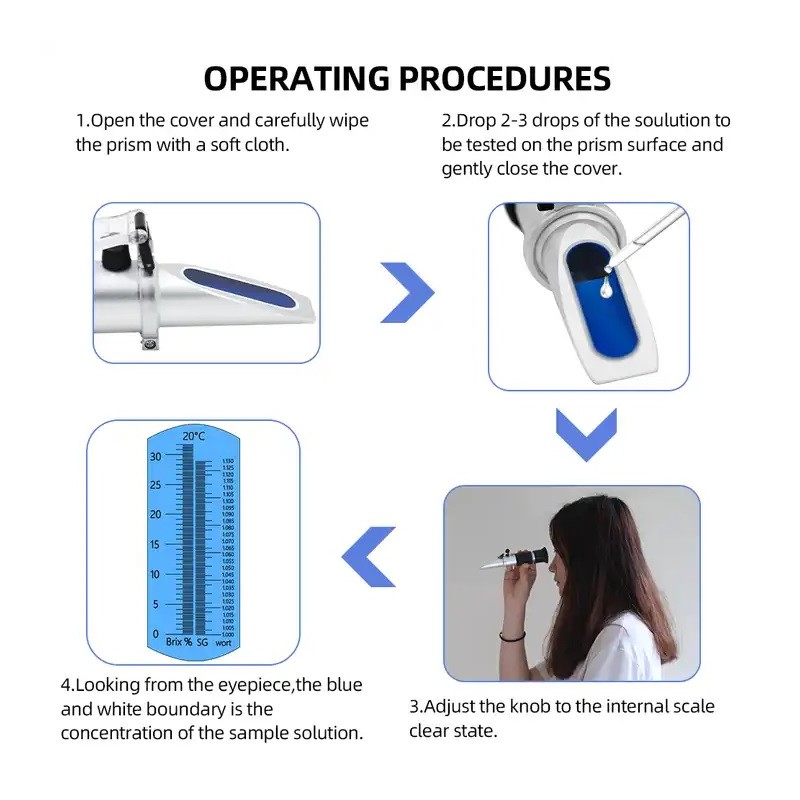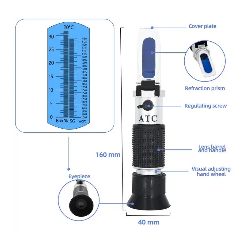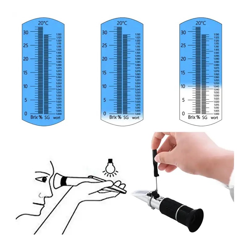 Mätområde: 0–32% Brix och 1.000–1.130 SG
