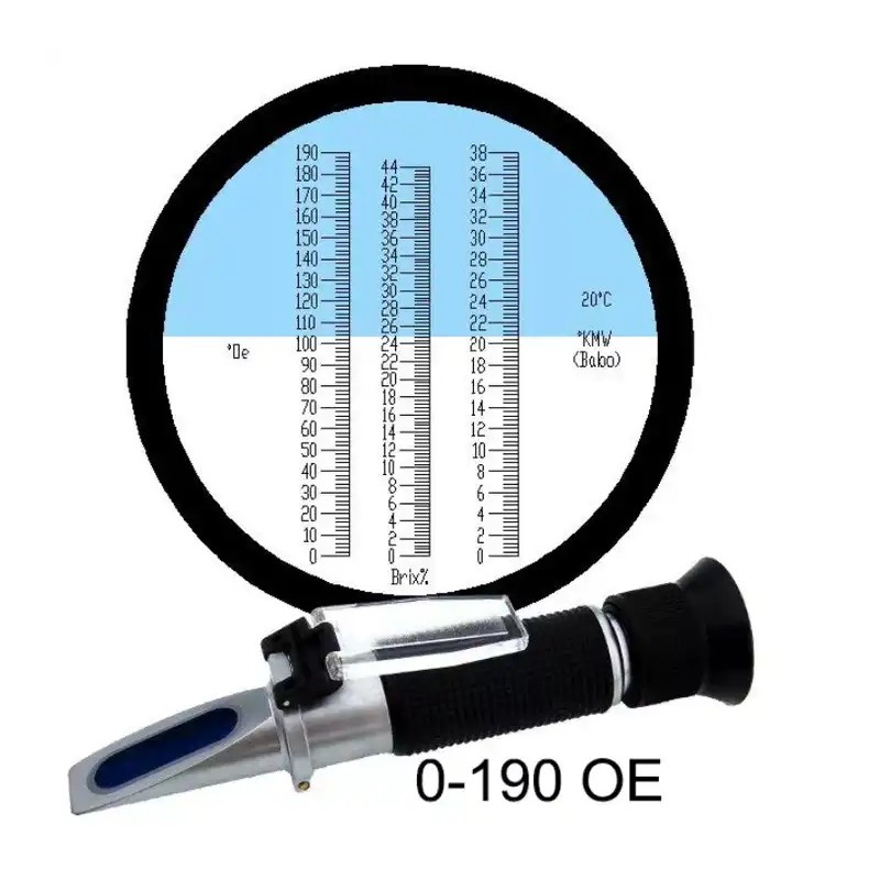 ✅ 3 skalor i ett instrument: 0–44% Brix, 0–190 °Öchsle, 0–38 °KMW (Baumé)