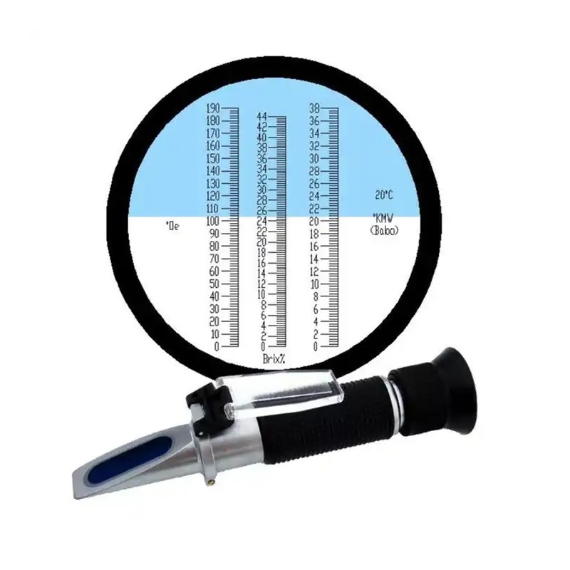 Refraktometern mäter brytningsindex och är idealisk för sockerhaltiga vätskor före jäsning. I drycker som innehåller alkohol kan resultatet avvika eftersom alkohol förändrar brytningsindexet. För mätningar efter jäsning rekommenderas ofta andra metoder eller korrektionstabeller.