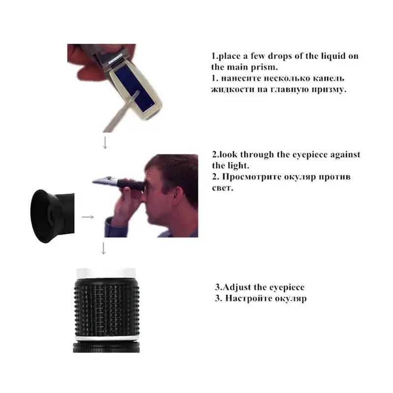 Refraktometern har tre skalor i ett och samma instrument: Brix, Öchsle (°Oe) och KMW (Baumé). Det gör det enkelt att bedöma sockerhalten i druvjuice, fruktjuice och andra sockerhaltiga vätskor som läsk eller honung. Du behöver bara 2–3 droppar på prismat, stänga locket och läsa av värdet genom okularet mot en ljuskälla.
