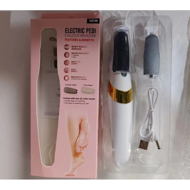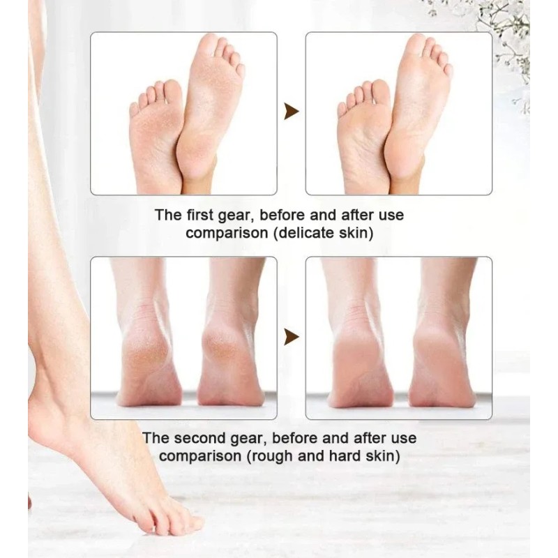 Med denne elektriske fodfil fjerner du nemt død og hård hud på få minutter. Den glider ubesværet over dine fødder og hæle, fjerner sikkert og smertefrit døde, tørre, hårde hudlag. Der er to-trins justering.  Det hurtige gear kan nemt fjerne hård hud på dine fødder, bagefter bruges det langsomme gear til finslibning. Håndtaget på fodskrubberen er ergonomisk designet, ligger godt i hånden. Skift nemt mellem de 2 ruller med forskellig grovhed.