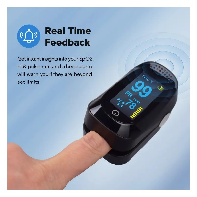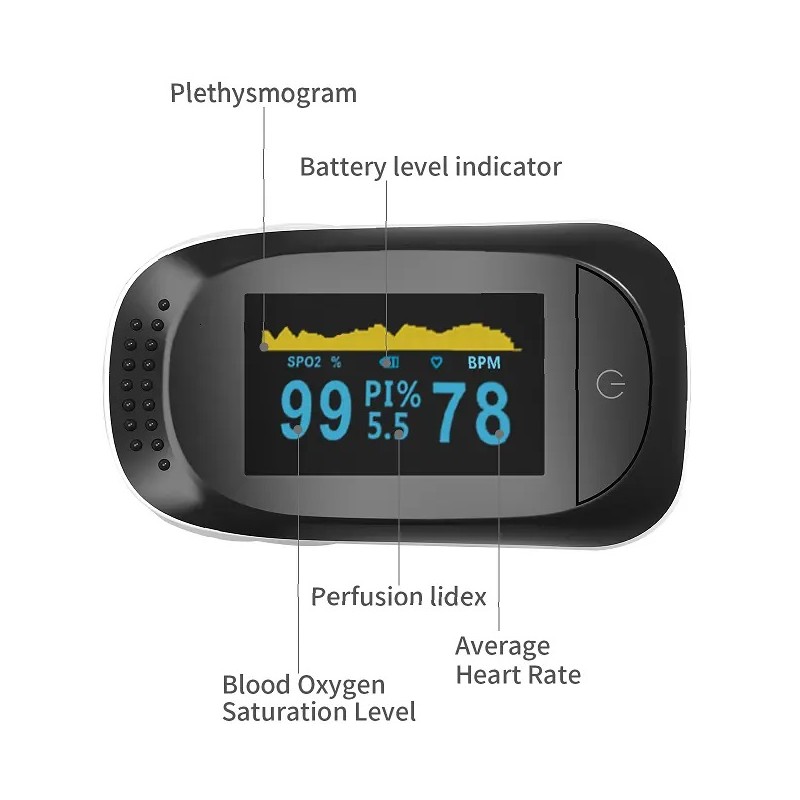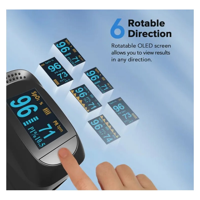 Få en snabb och tydlig överblick över din hälsa med denna smarta och bärbara fingerpulsmätare. Oximetern mäter syremättnad (SpO₂) och pulsfrekvens på några sekunder, så du enkelt kan följa kroppens status – oavsett om du tränar, vilar eller vill övervaka dig dagligen.