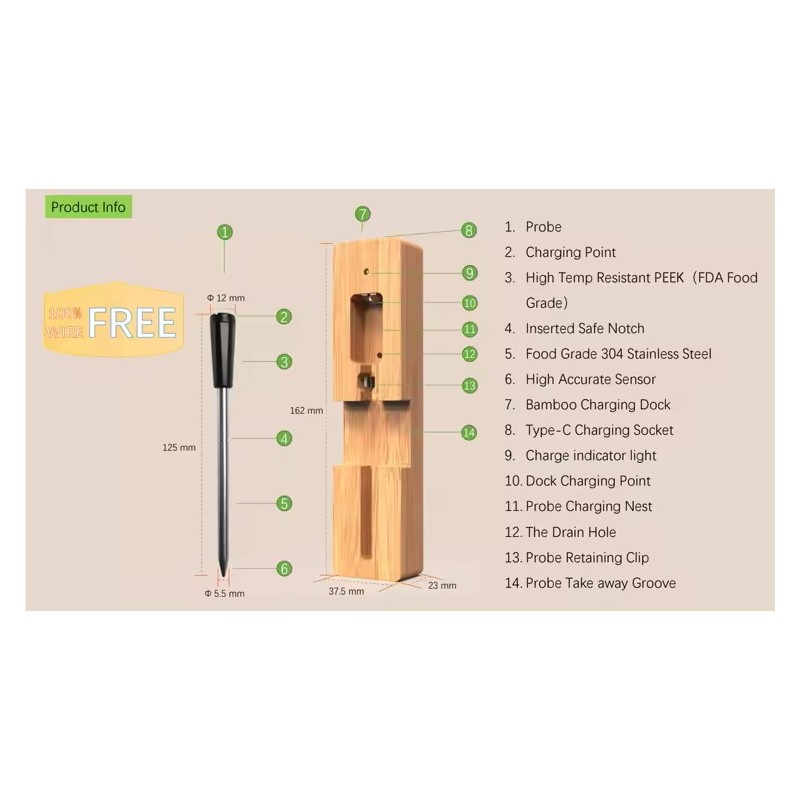Termometern är utrustad med en avancerad och vattentålig sond (IPX7) som säkerställer noggranna mätningar under alla förhållanden. Snabbladdning på endast 5–10 minuter ger upp till 4 timmars användning – perfekt både till vardag och fest.