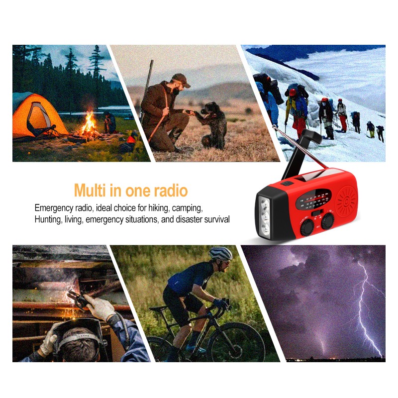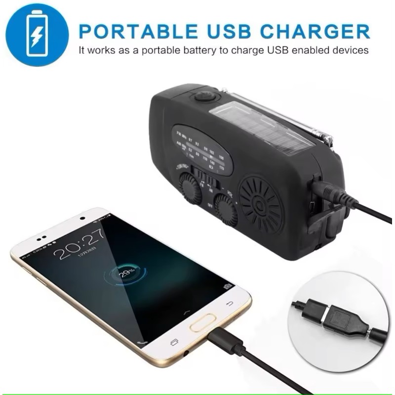 Denne nødradio kombinerer funktionerne af en radio, lygte, powerbank og kan lades op med solcelle, håndsving eller ledning. Ideel til udendørs eventyr, beredskab eller nødsituationer. Lad den være din pålidelige ledsager.