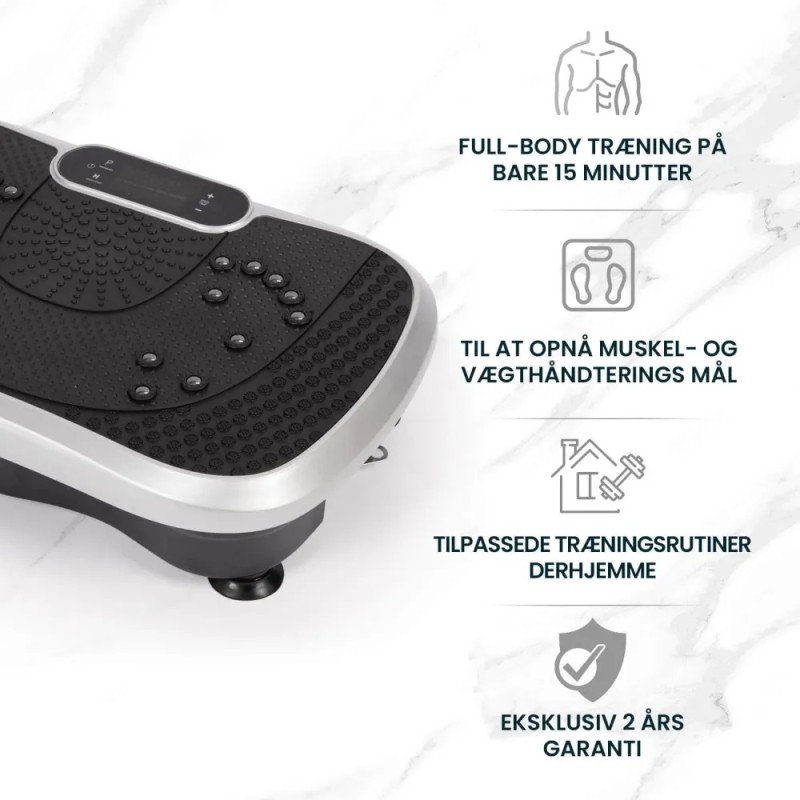 Denne vibrationsplatform er perfekt til dig, der ønsker en effektiv, skånsom og alsidig træningsform kombineret med afslappende massage – alt i én kompakt og kraftfuld enhed.