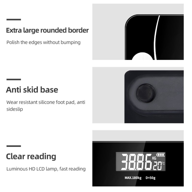 Det hærdet sorte glas er ekstremt holdbart og stærkt takket være den maksimalt tilladte målte vægt på op til 180 kg. Vægten kan gemme grundlæggende data for op til 8 personer – Den husker deres køn, alder, vægt og højde.