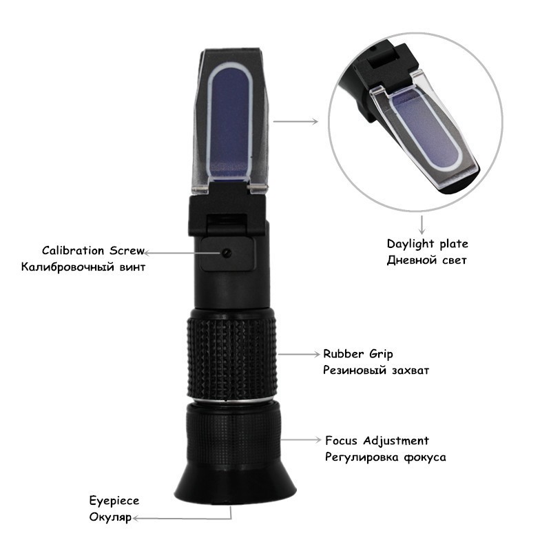 Håll refraktometern mot en ljuskälla och titta genom okularet.